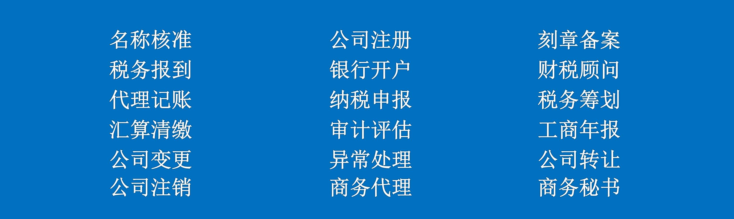 公司以服務(wù)于中小微企業(yè)從創(chuàng)立到注銷(xiāo)全生命周期財(cái)稅業(yè)務(wù)為己任,業(yè)務(wù)涵蓋:名稱(chēng)核準(zhǔn)、工商注冊(cè)、資本驗(yàn)證、刻章備案、稅務(wù)報(bào)到、銀行開(kāi)戶(hù)、財(cái)稅顧問(wèn)、代理記賬、納稅申報(bào)、稅務(wù)籌劃、匯算清繳、財(cái)報(bào)審計(jì)、稅務(wù)審計(jì)、資產(chǎn)評(píng)估、工商年報(bào)、工商變更、異常處理、公司轉(zhuǎn)讓、注銷(xiāo)登記、商務(wù)代理、商務(wù)秘書(shū)及其他專(zhuān)項(xiàng)代辦服務(wù)。